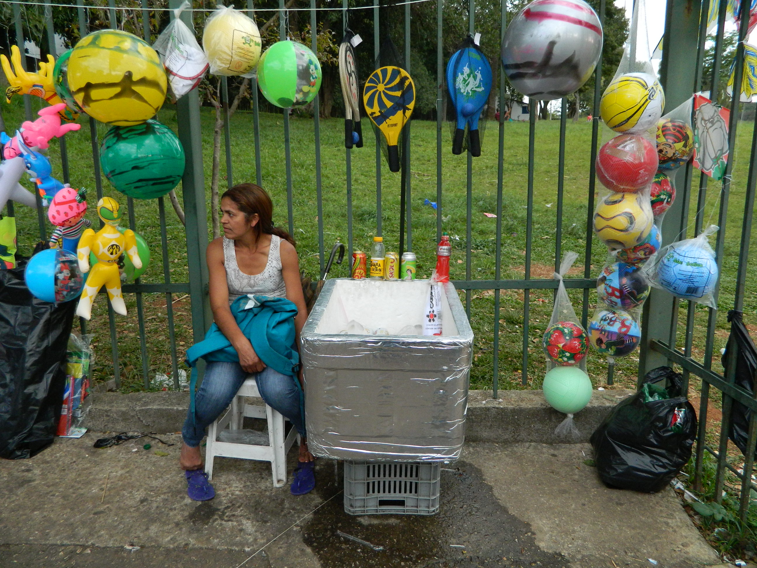 Ela estava vendendo água, sucos, refrigerantes e bonecos infláveis do lado de fora do Museu do Ipiranga – o que diz que faz todo final de semana, há mais de dez anos.