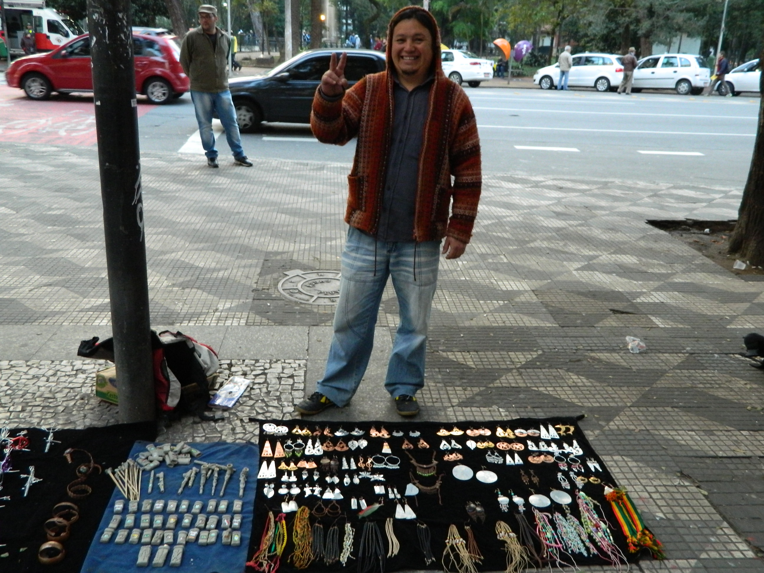 O chileno Guilherme Ianez, de 45 anos, trabalhava vendendo artesanatos na Praça da República num sábado quando seu rosto simpático me convidou para ir falar com ele – antes eu tinha olhado para vários vendedores, mas nenhum parecia estar muito “na vibe” de conversar…