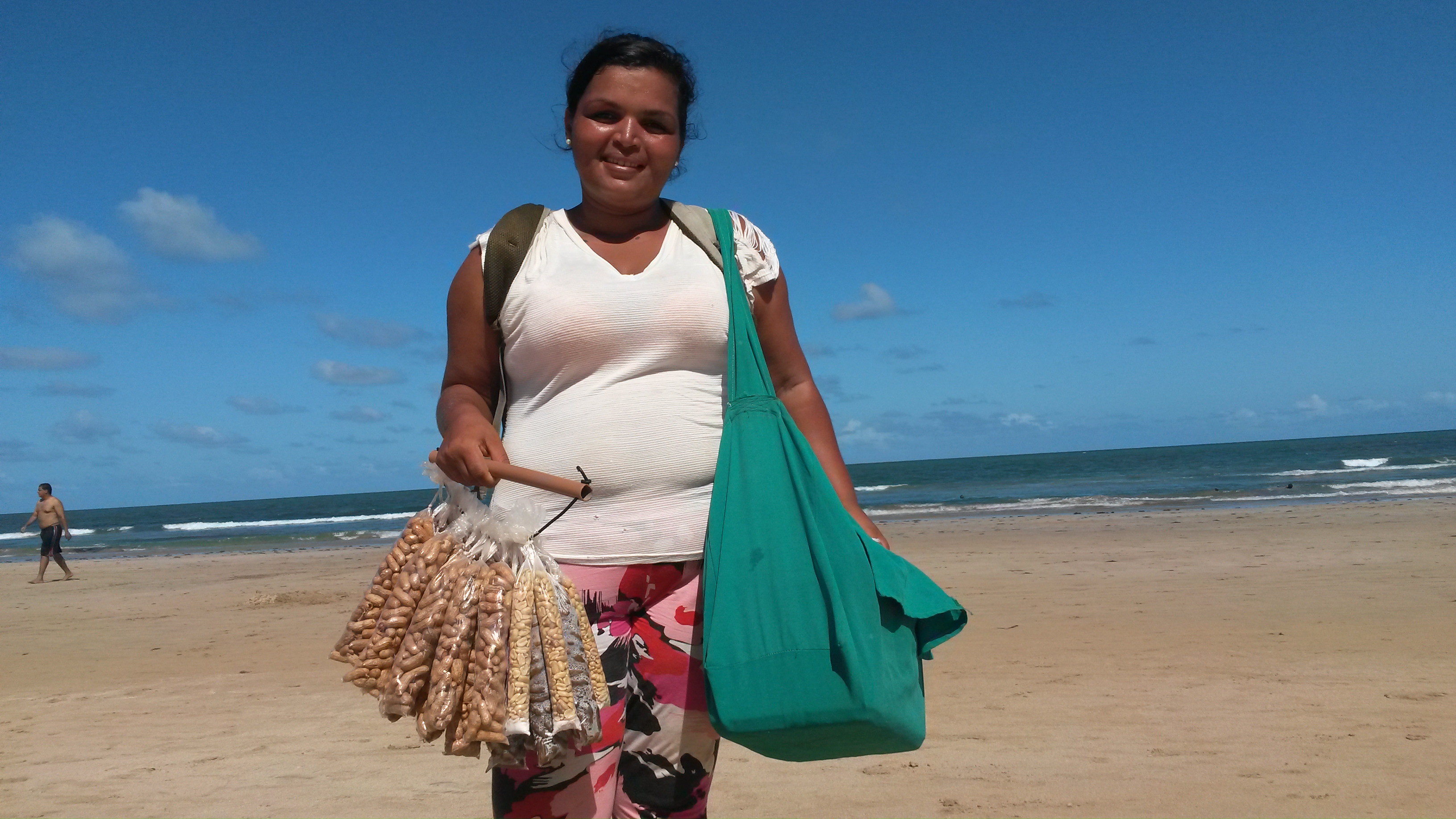 Encontrei a jovem vendendo amendoins e castanhas na praia de Boa Viagem, no Recife, justo no dia de seu aniversário.