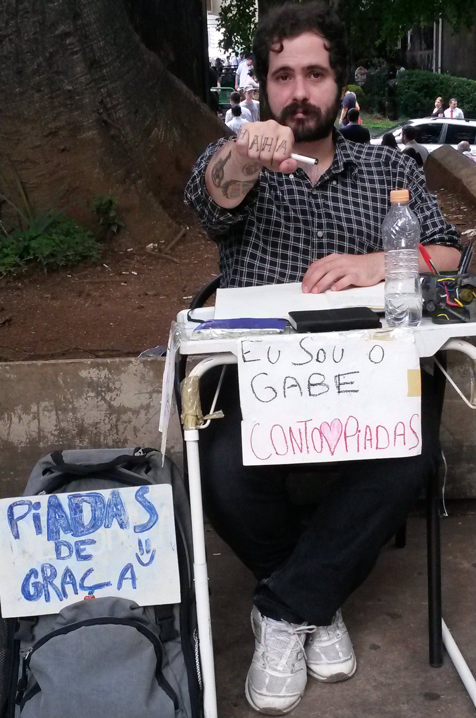Gabe acatou a sugestão, colocou o cartaz e passou a praticar na rua as piadas para contar à noite no bar. Faz isso há cerca de cinco meses. “Eu fico escrevendo e contando piada. Testando meu material ao mesmo tempo em que crio.” Além da Avenida Paulista ele costuma ficar também em outros lugares públicos de São Paulo, como o Parque do Ibirapuera ou o Minhocão.