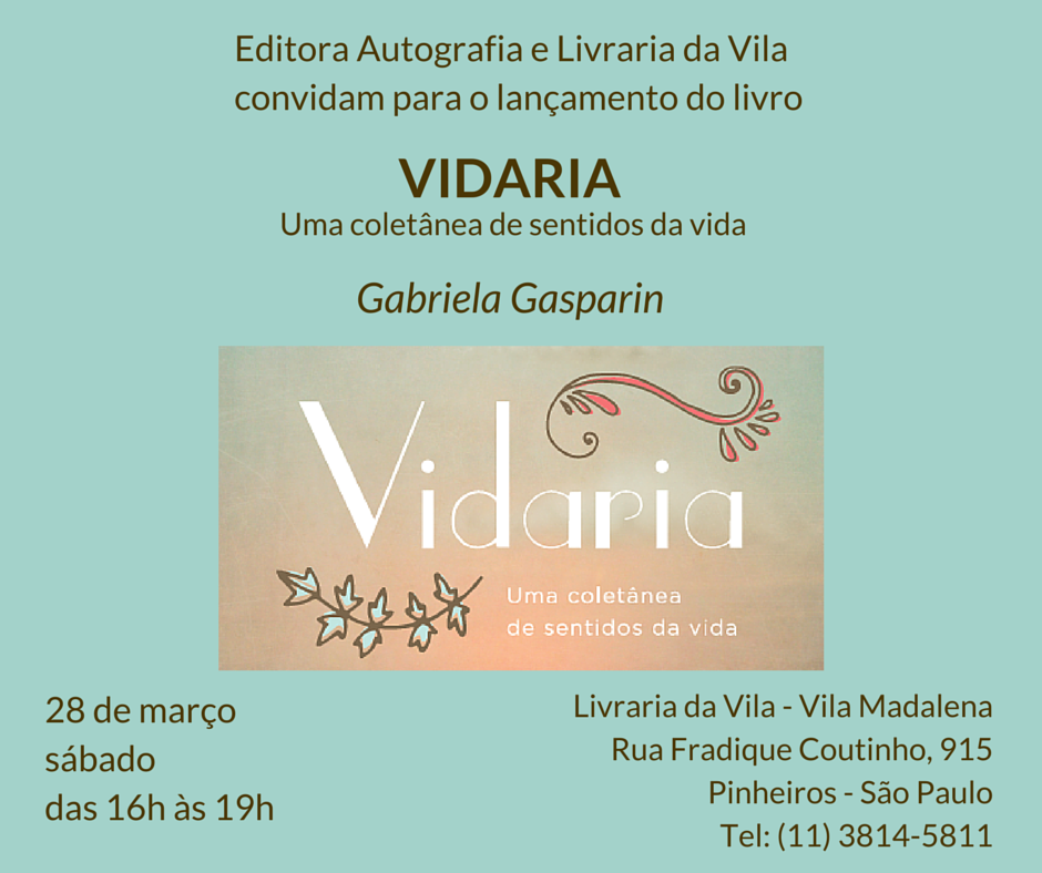 Foi num sábado de garoa, em julho de 2013, que eu resolvi colocar para fora a inquietação que tanto me incomodava e saí por aí perguntando o sentido da vida a desconhecidos. Criei o blog Vidaria (www.vidaria.com.br) para compartilhar as histórias, mas não fazia a menor ideia do que elas poderiam render. De lá para cá, já foram mais de 100 entrevistas. E imaginem só como eu não estou contente em ter reunido uma coletânea delas num lindo livro, que reescrevi com muito carinho. Convido a todos para o lançamento do “Vidaria, uma coletânea de sentidos da vida”, em parceria com a Autografia Editora. Será no dia 28 de março, um sábado, das 16h às 19h, na Livraria da Vila, na Rua Fradique Coutinho, 915, em Pinheiros, em São Paulo. Para quem quiser acompanhar mais detalhes do lançamento, é só entrar no link do evento no Facebook (clique aqui) e participar! Quem não puder ir, dá para comprar pelo site da editora, neste link: http://goo.gl/1xmAzX Sobre o livro Além das histórias reescritas, o livro está cheio de poemas e ensaios sobre os sentidos da vida. Ganhou ainda um prefácio instigante escrito pelo filósofo e psicanalista Arthur Meucci, a meu pedido – a que, aliás, sou muito grata por todo o apoio pelo projeto! Sou suspeita para falar, mas há quem diga que “depois de ler Vidaria, você nunca mais vai enxergar o mundo da mesma forma” – as palavras são de meu amigo e colega, o jornalista Jorge Soufen Jr., que convidei para escrever o texto da orelha. Para quem não acompanha tanto assim o blog, já falei com artistas, moradores de rua, executivos. Com pobres e ricos. Crianças, vovós e vovôs. Fui à prisão e falei com detentas. Falei com travestis e líderes religiosos. Falei com os turistas que vieram para o Brasil na Copa. Conversei sobre o sentido da vida com minha família. Aproveito para agradecer, do fundo do meu coração, a todos que aceitam compartilhar suas histórias para que o projeto aconteça, sem vocês, é claro, tudo isso jamais seria possível. E muito obrigada ainda aos amigos, familiares e leitores que acompanham e me incentivam a continuar, vocês são muito importantes! O projeto para mim é muito mais do que um livro ou um blog. São muitos dias da minha própria vida que tenho dedicado para conhecer e divulgar novas histórias, com o intuito de dar mais sentido à minha, à dos leitores, e instigar o autoconhecimento em todos nós. Pode parecer utópico, mas eu realmente acredito que pensar sobre o sentido da vida pode nos tornar pessoas melhores! Gente, apareçam! Convidem amigos, familiares, suas vovós e vovôs. Tenho certeza que todos vão gostar muito – e até se emocionar – com o livro! Ajudem a divulgar! Estarei lá até o último minuto para receber a todos! Obrigada